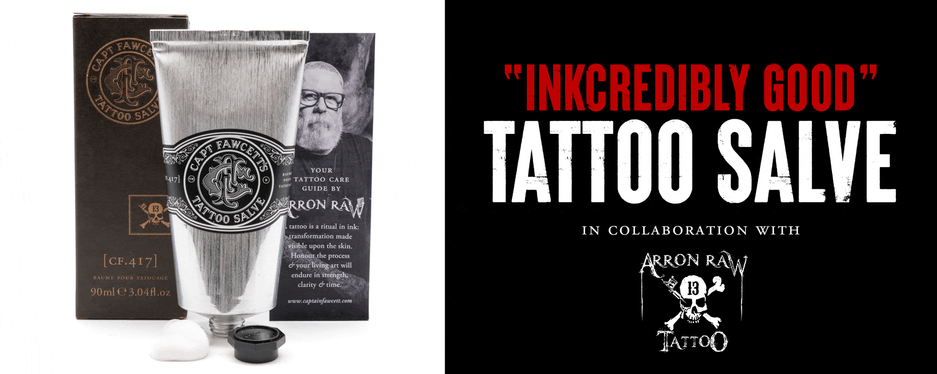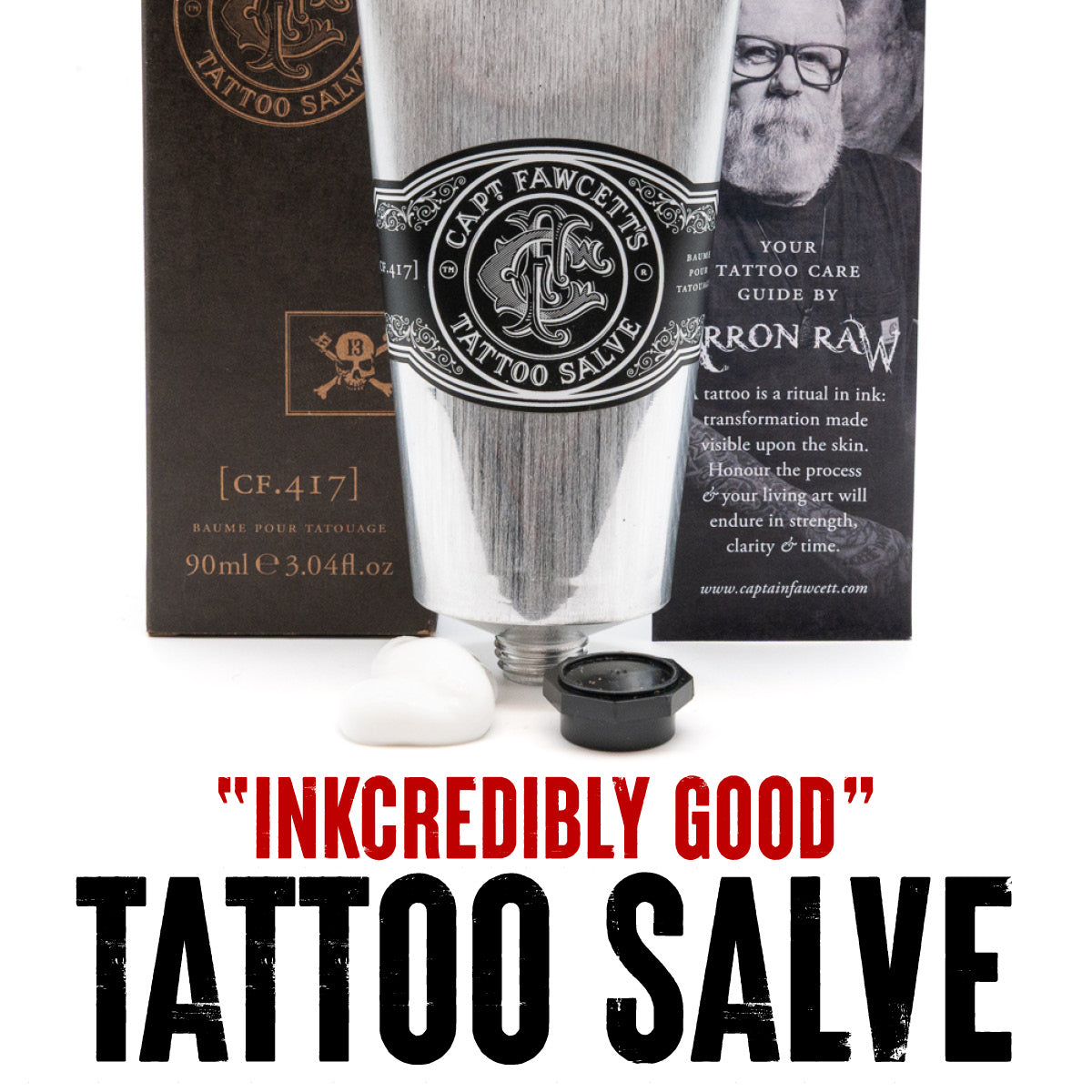 Tattooing is a ritual, a moment of transformation made visible upon the skin. Created in collaboration with master tattoo artist Arron Raw, Captain Fawcett’s Tattoo Salve is not simply aftercare. It is a complete tattoo ritual in a single tube, formulated to prepare the skin before tattooing, support healing in the crucial early weeks, and maintain strength, clarity and vibrancy long after the ink has settled into its story.